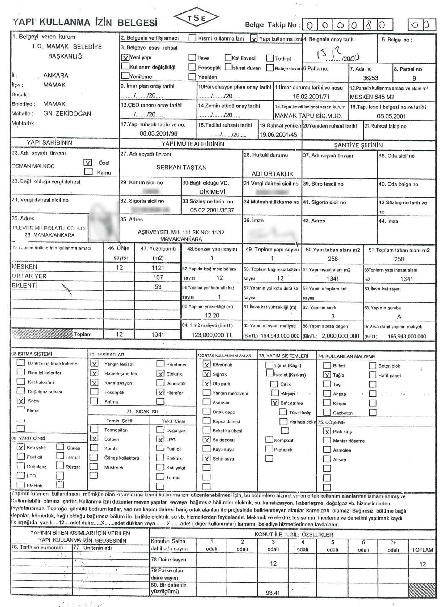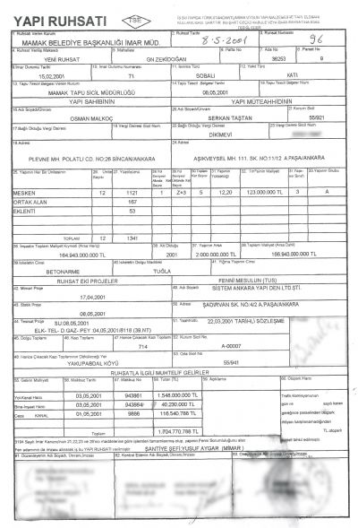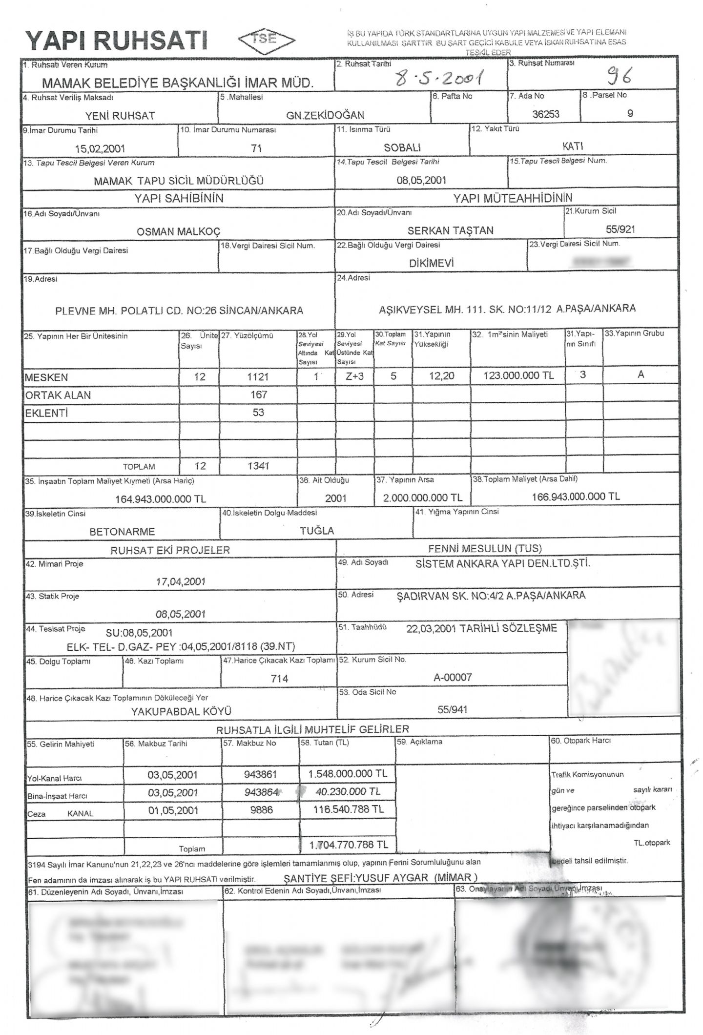 Ankara / Mamak Proje Adı: Taştan 1 Ada – Parsel: 36253 - 9 Bağımsız Bölüm: 12 Daire Toplam İnşaat Alanı: 1341 M2 Adres: General Zeki Doğan Mahallesi